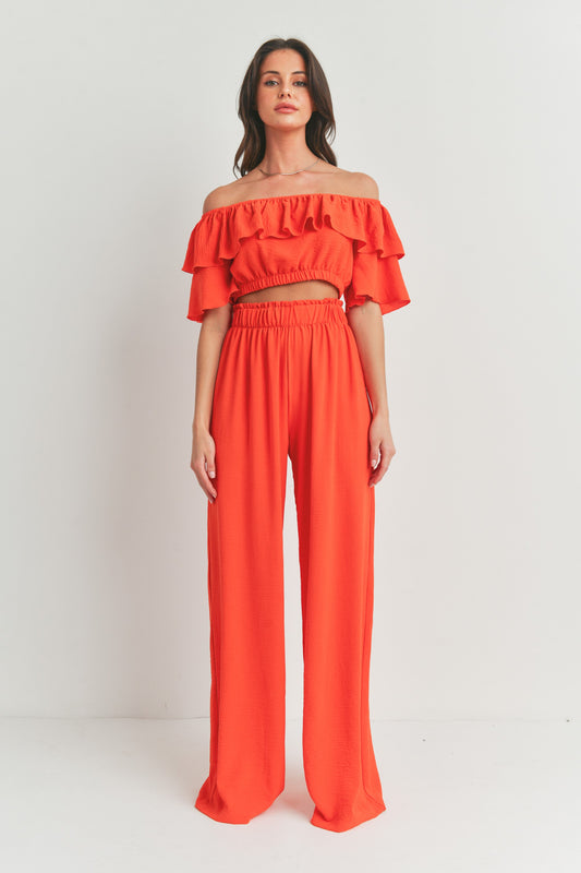 Off Shoulder Ruffle Crop Top and Pants - 2 Piece Set