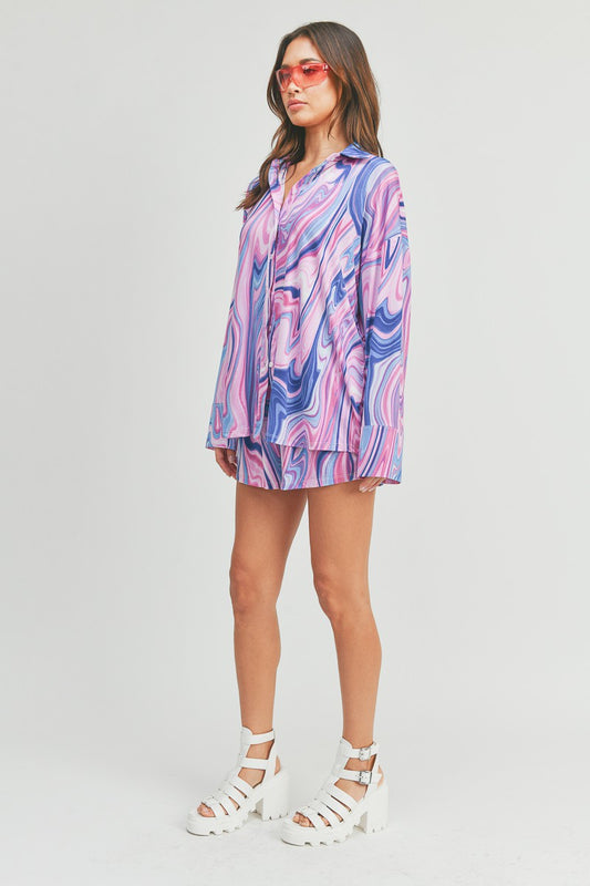 Tie Dye Long Sleeve Button Down Shirt and Pajama Shorts - 2 Piece Set